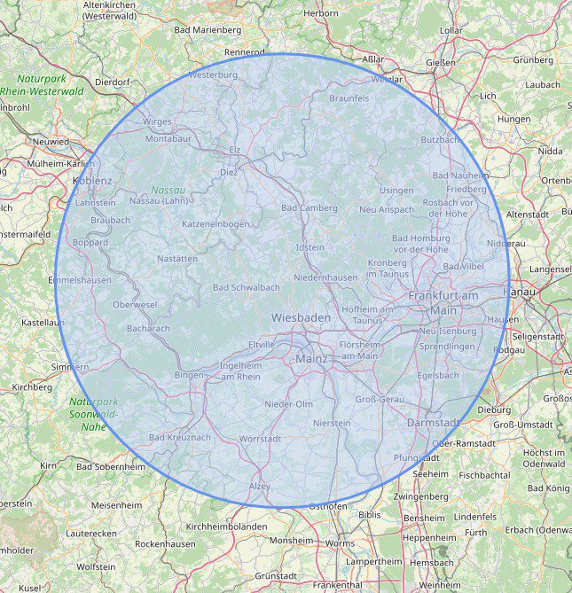 Unser Einzugsgebiet erstreckt sich über einen Umkreis von rund 50 km um Taunusstein. Innerhalb dieses Gebietes sind wir unter anderem in Taunusstein, Bad Schwalbach, Wiesbaden, Mainz, Eltville am Rhein, Rüdesheim am Rhein sowie in vielen weiteren Städten und Gemeinden für Sie im Einsatz. Die Karte zeigt Ihnen unseren Servicebereich übersichtlich dargestellt.